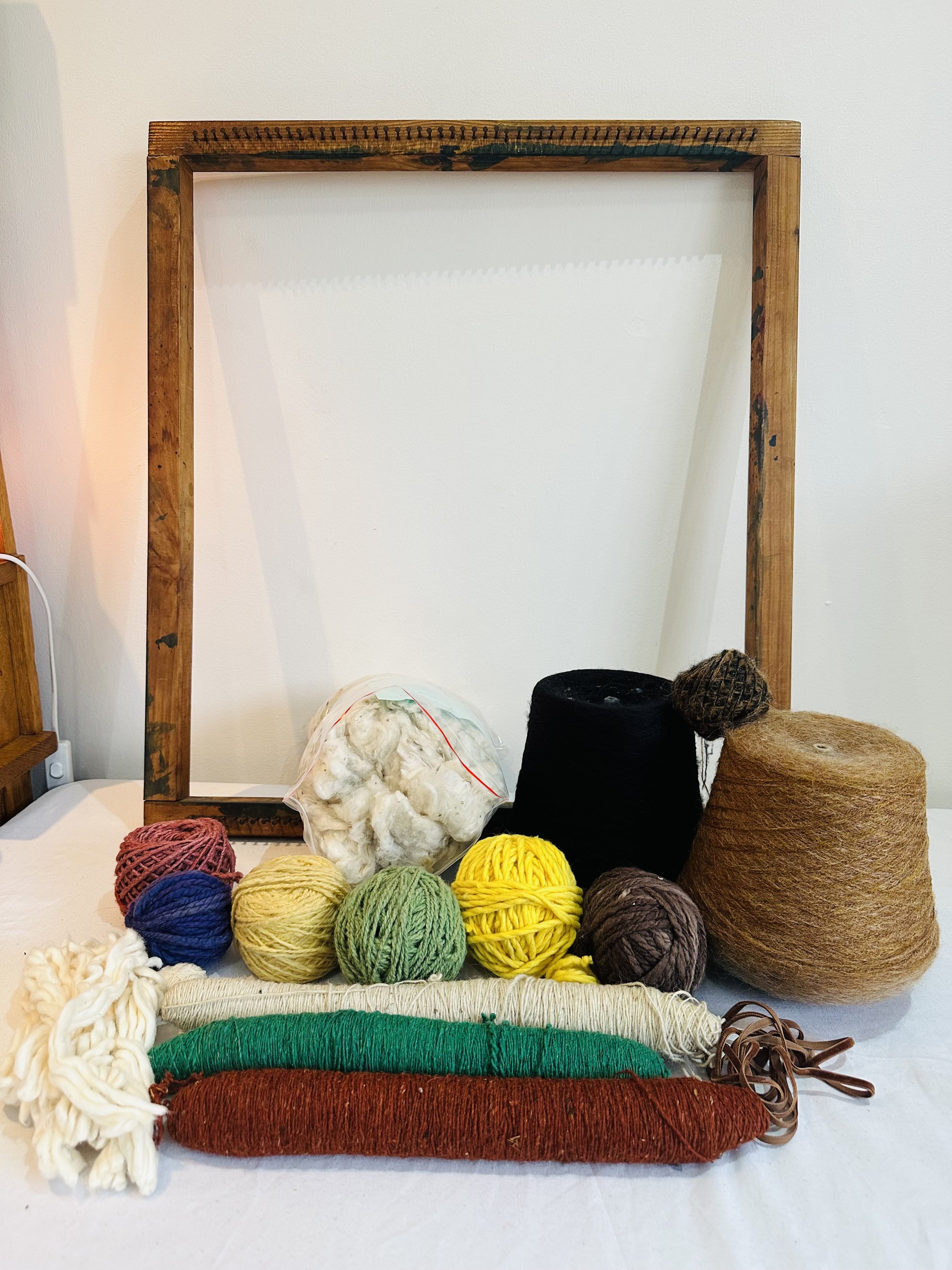 This work marks my first weave on a small frame loom and carries the quiet rhythms of making at home. Cotton warp supports handspun merino and mohair, with additional merino, mohair, and karakul fibres shaping the surface, finished with cotton fringes. As I worked, my six-year-old son brought small objects to include; one tiny leaf, offered with great seriousness, remains in the weave, honouring attentiveness and shared moments.