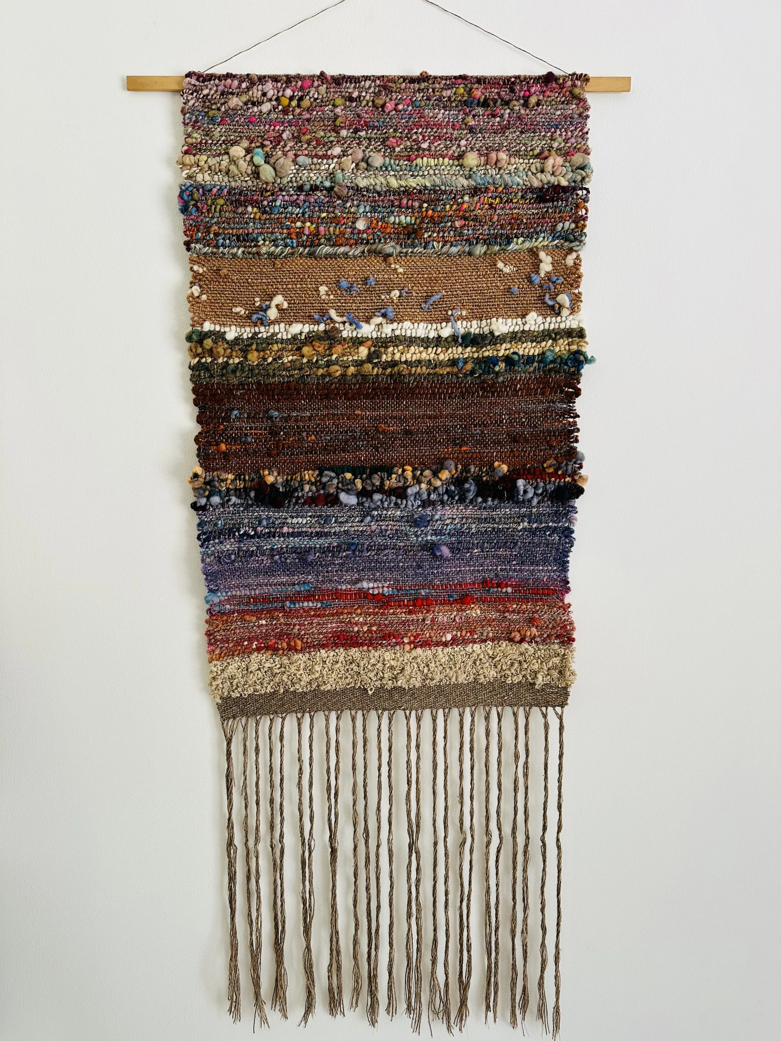 This work emerged from generosity passed hand to hand: a bag of small, precious remnants of natural fibres, gifted by someone who had received them in the same spirit, and a fragment of velvet ribbon from a dear friend. As these materials came together on the loom, a deep sense of gratitude guided the process, allowing each thread to honour its own history while becoming part of a new whole. (SOLD)